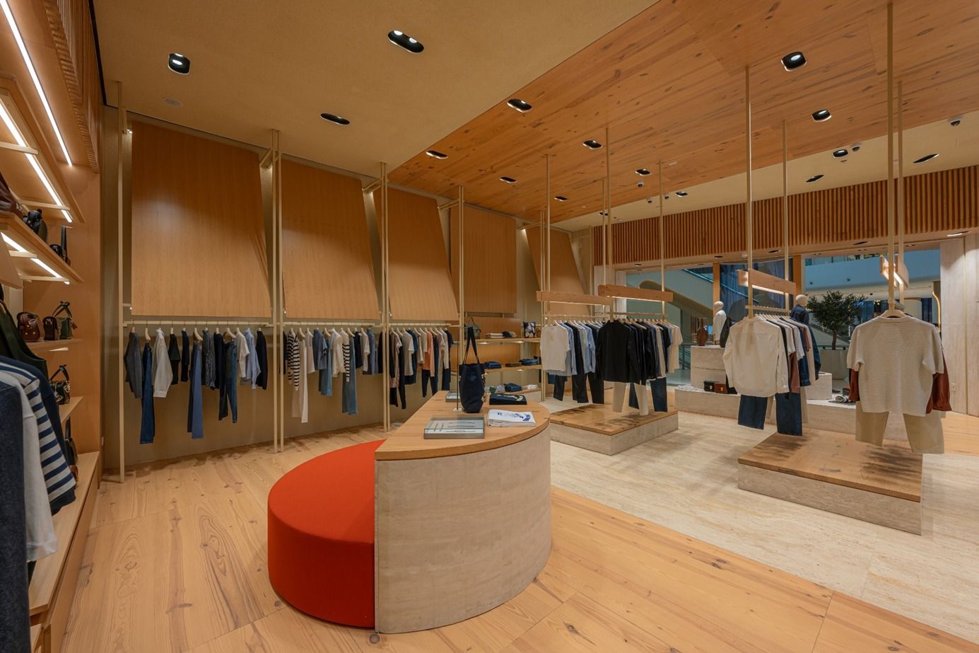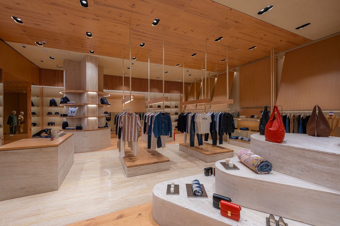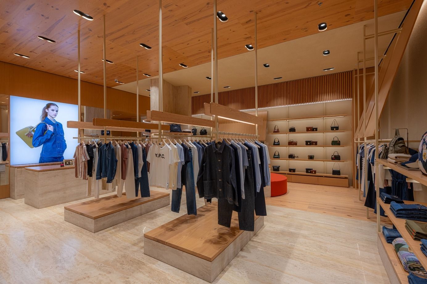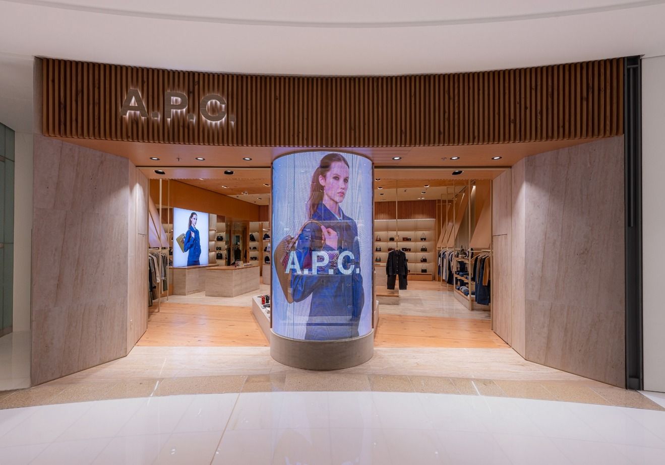 Description: A closer look at the A.P.C boutique in The Dubai Mall. Suspended rack structures, tight material junctions, integrated lighting – all delivered within an active luxury retail environment.